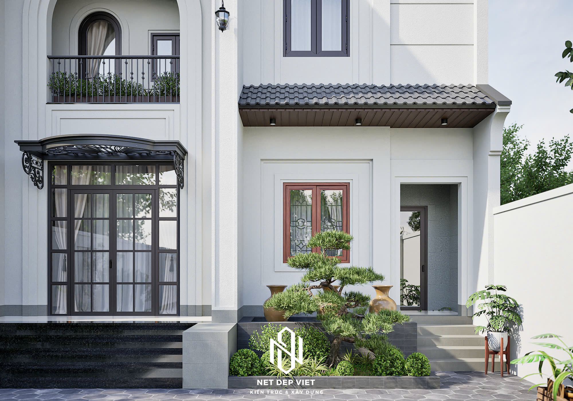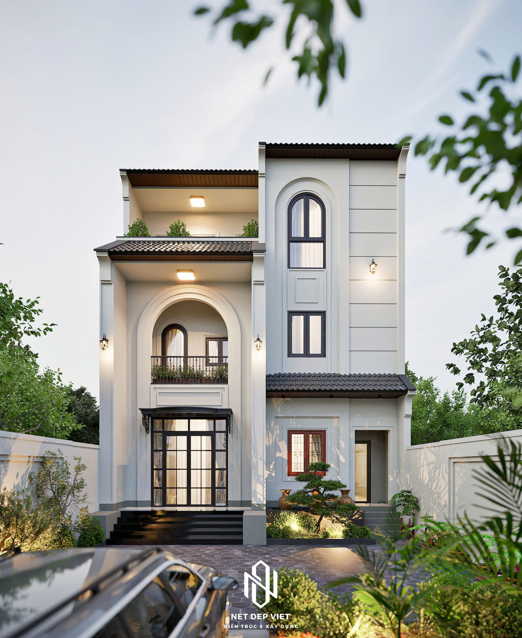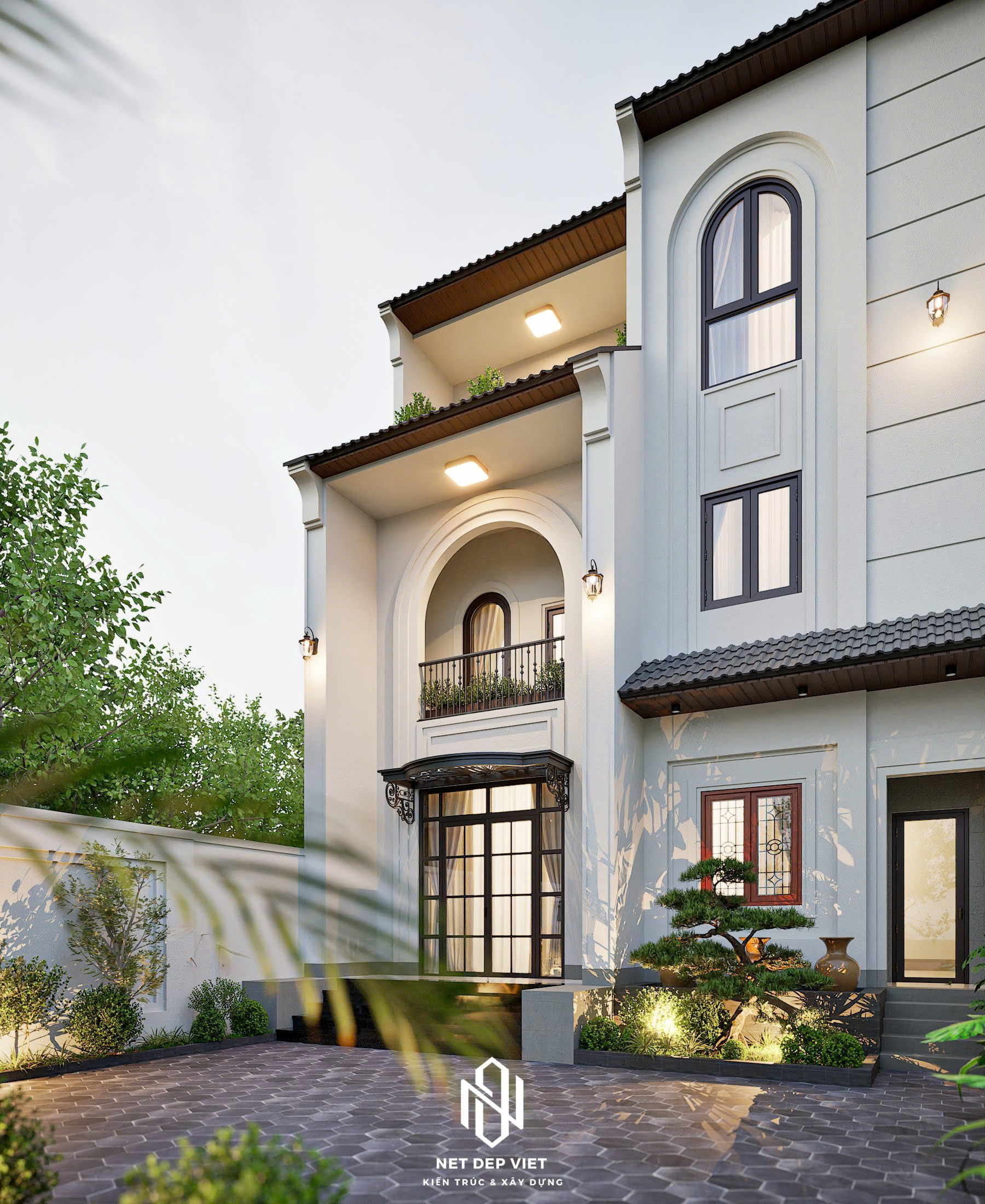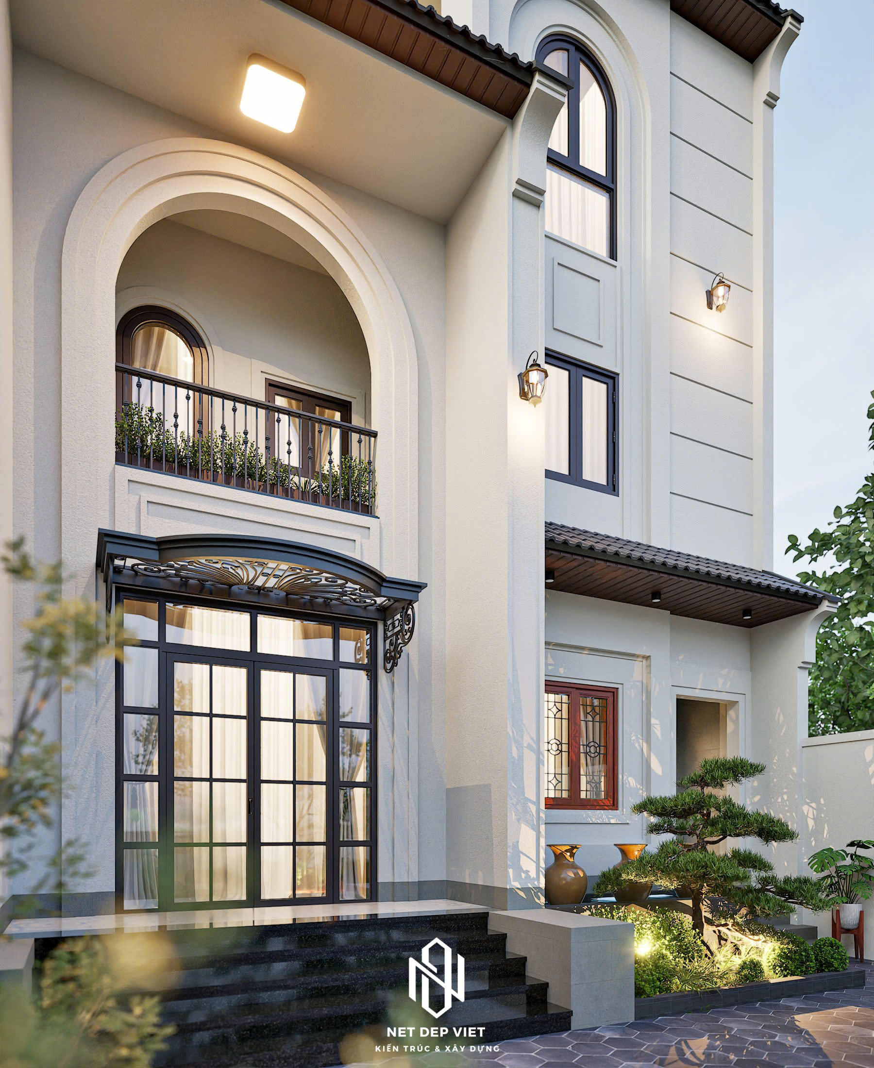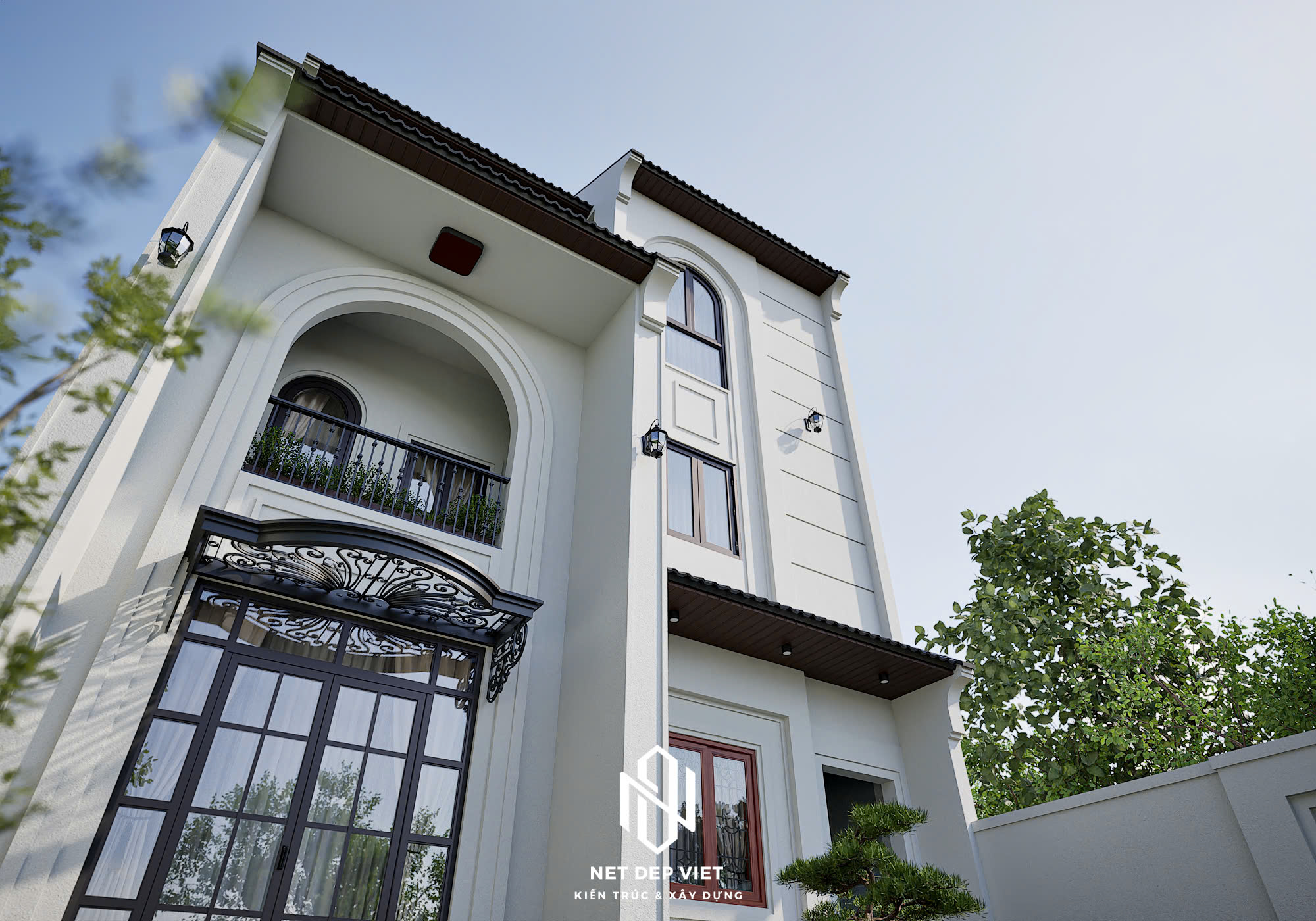 Ngôi nhà gây ấn tượng mạnh với phong cách kiến trúc Tân cổ điển tinh tế, nổi bật bởi tông màu trắng thanh thoát chủ đạo. Điểm nhấn nằm ở các chi tiết vòm cửa uốn lượn điệu nghệ cùng hệ ban công sắt mỹ thuật sang trọng.