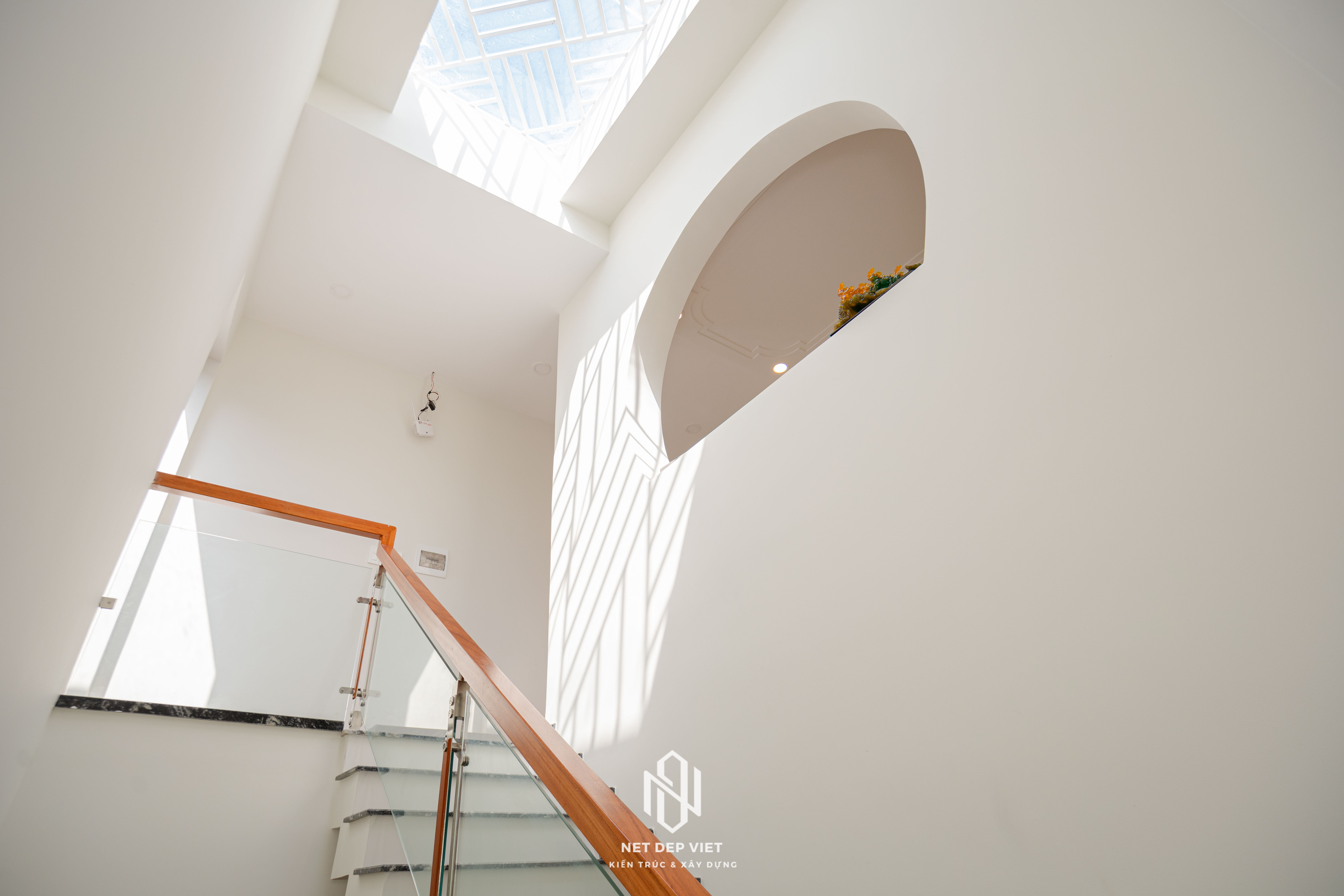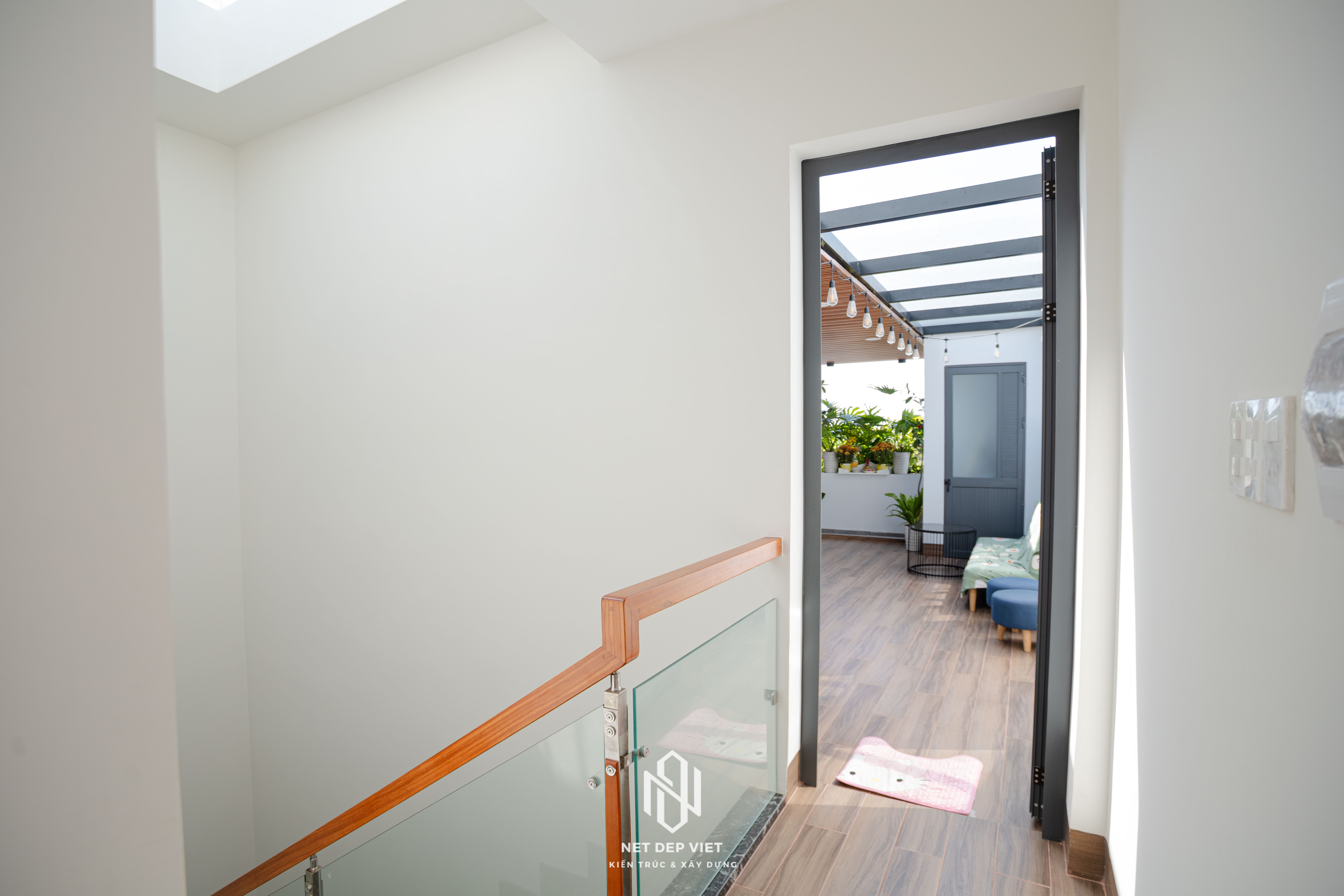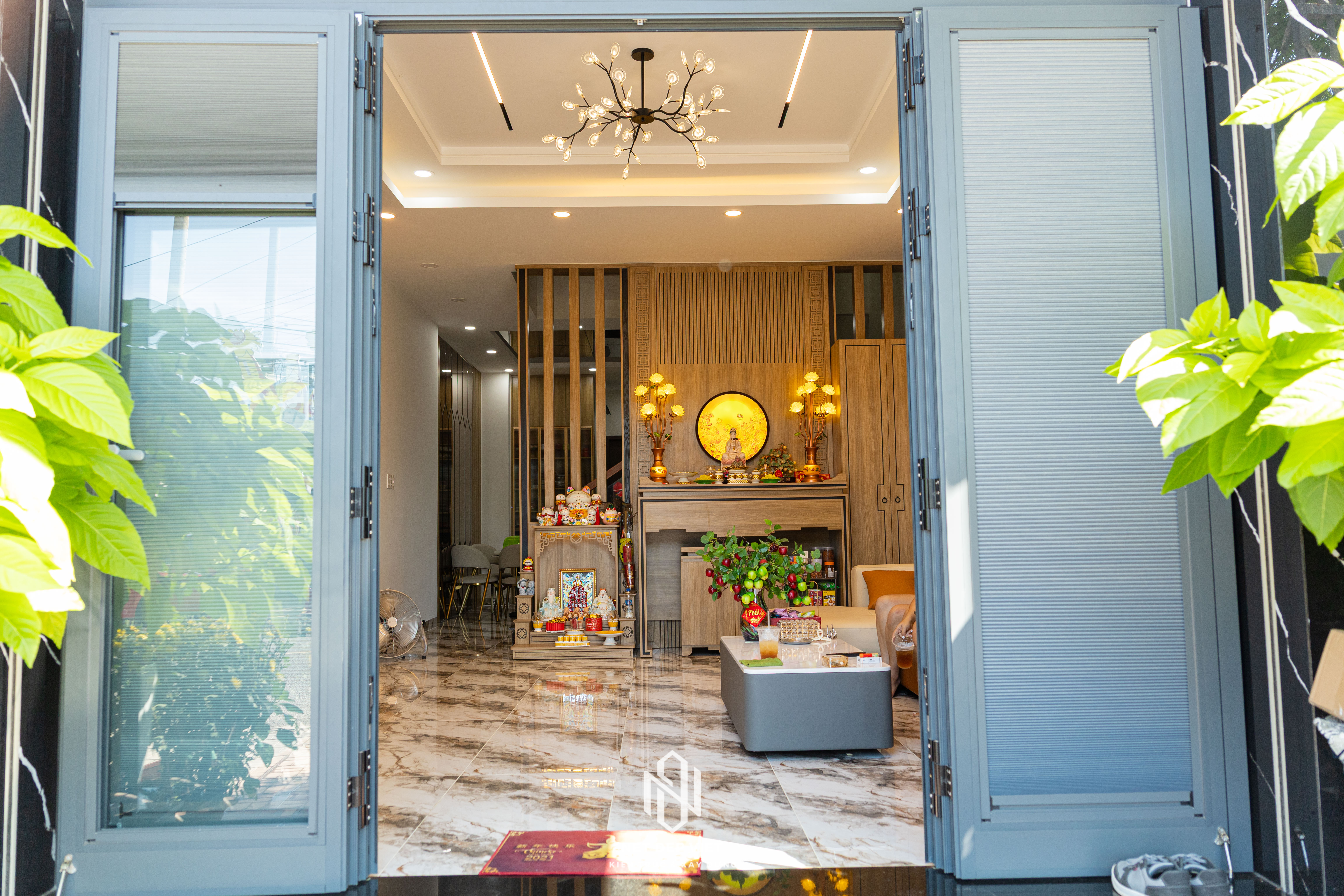 Tối ưu ánh sáng: Hệ thống cửa kính cường lực lớn không chỉ giúp ngôi nhà đón trọn ánh sáng tự nhiên mà còn tạo tầm nhìn mở rộng, xóa tan cảm giác bí bách của nhà phố.