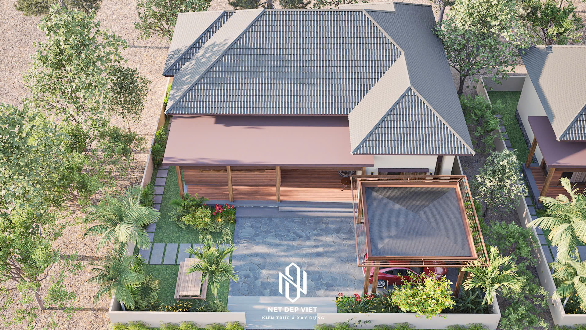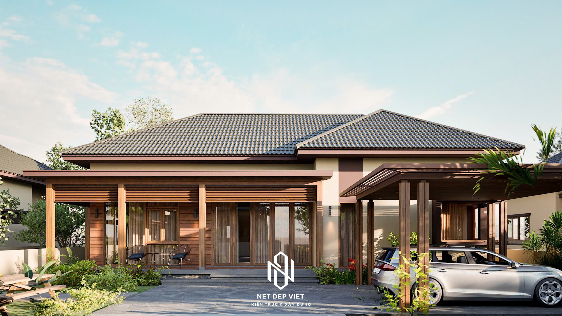Mẫu thiết kế nhà vườn 1 tầng mang phong cách hiện đại pha chút nét mộc mạc của kiến trúc Á Đông, tạo nên không gian sống yên bình và đẳng cấp.