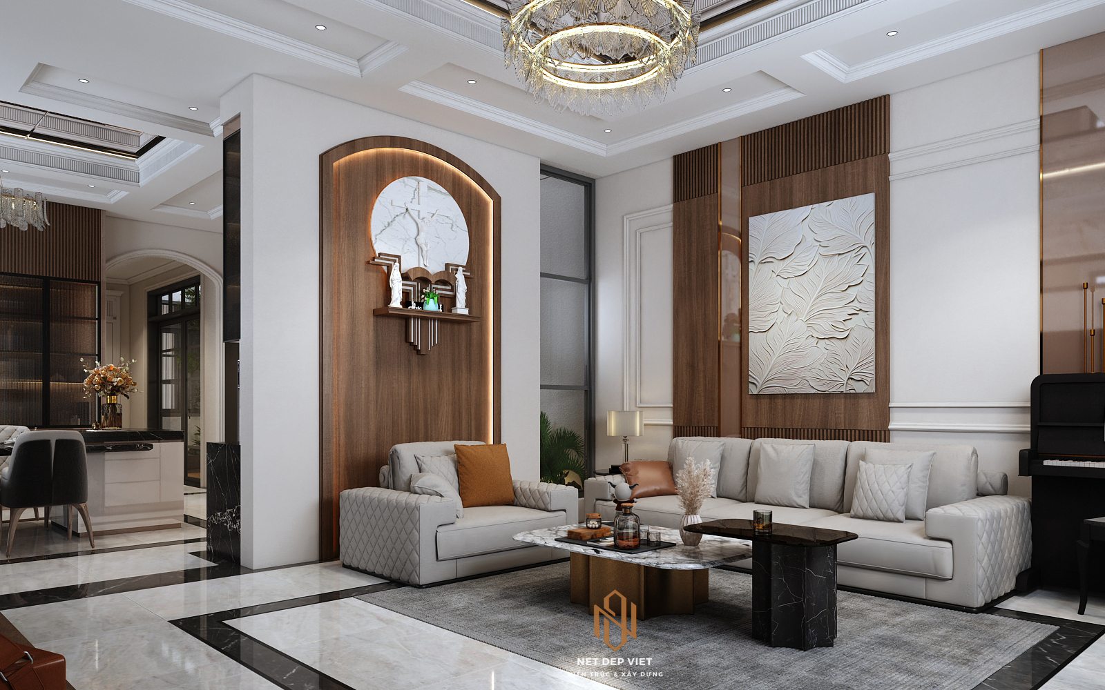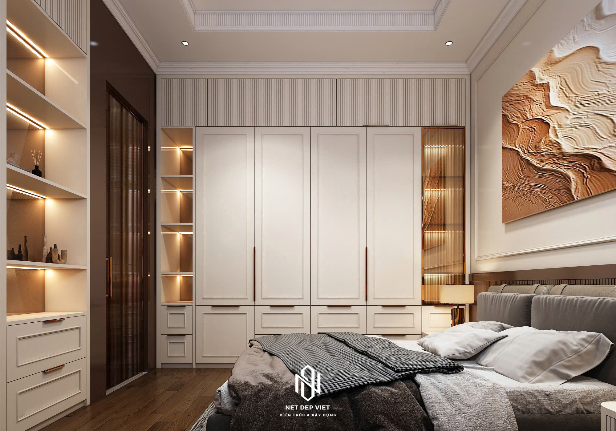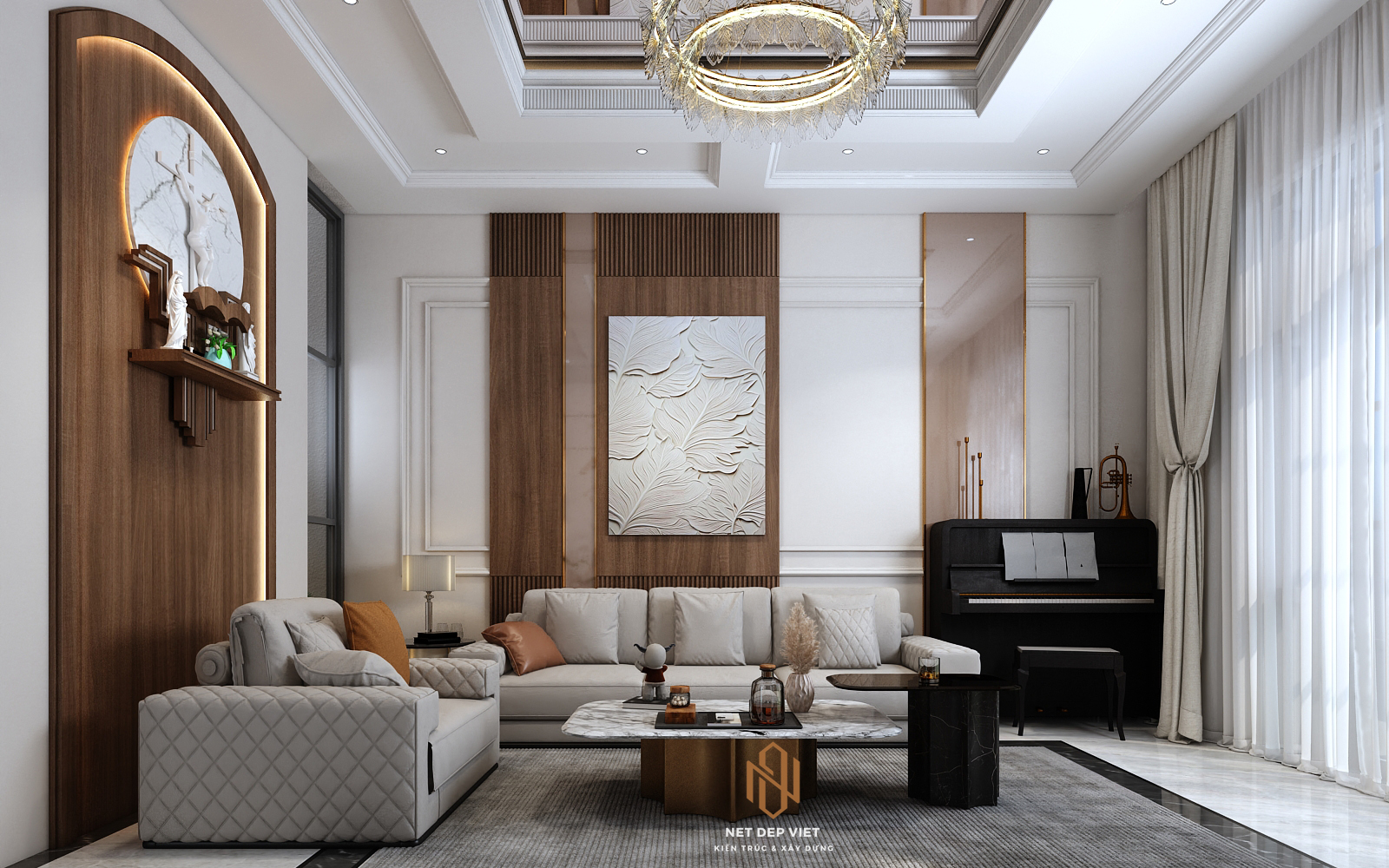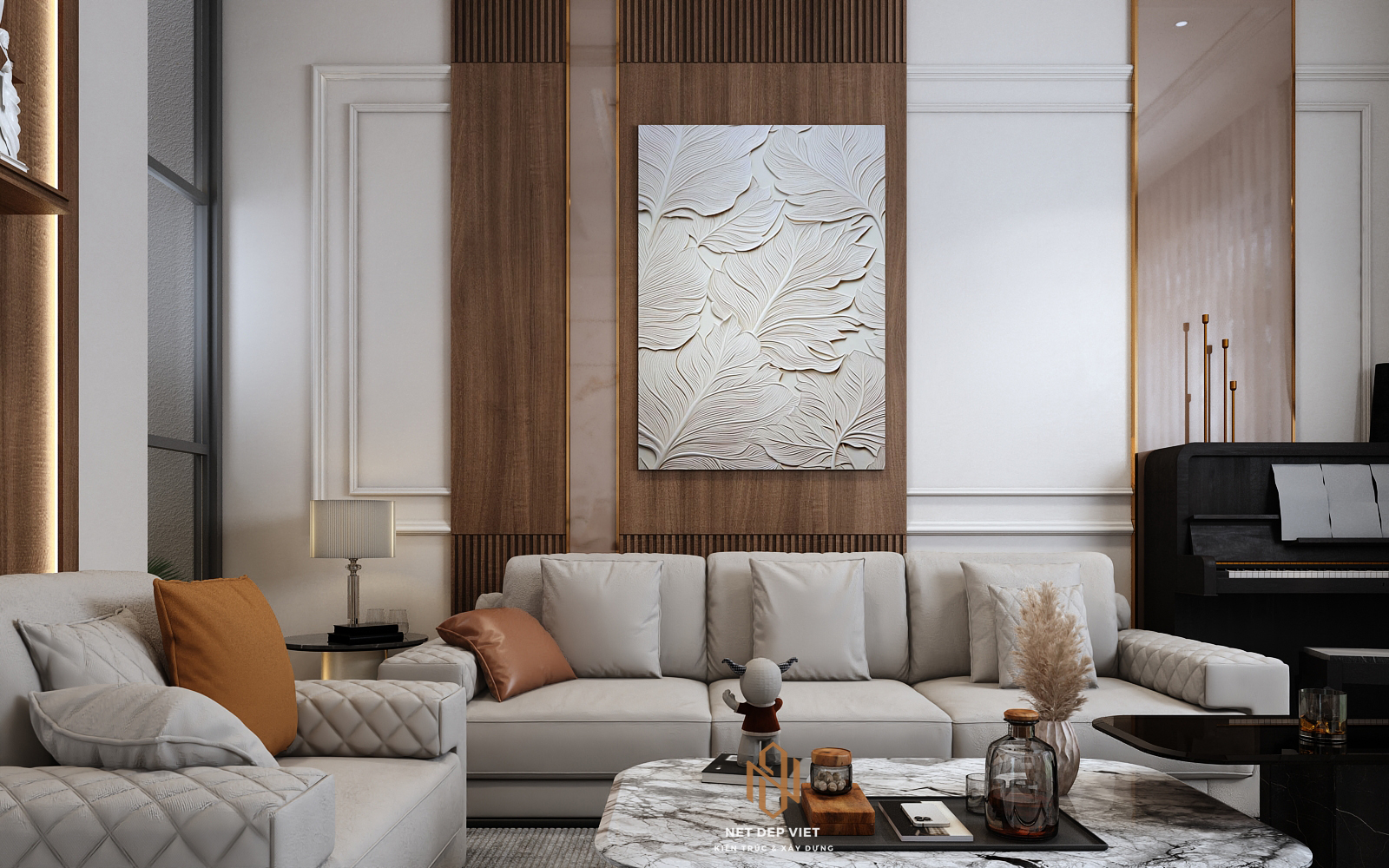 Màu sắc: Sự kết hợp giữa màu trắng (hành Kim/Thủy) và màu gỗ (hành Mộc/Hỏa) tạo nên sự hài hòa ngũ hành, ấm cúng và an yên.