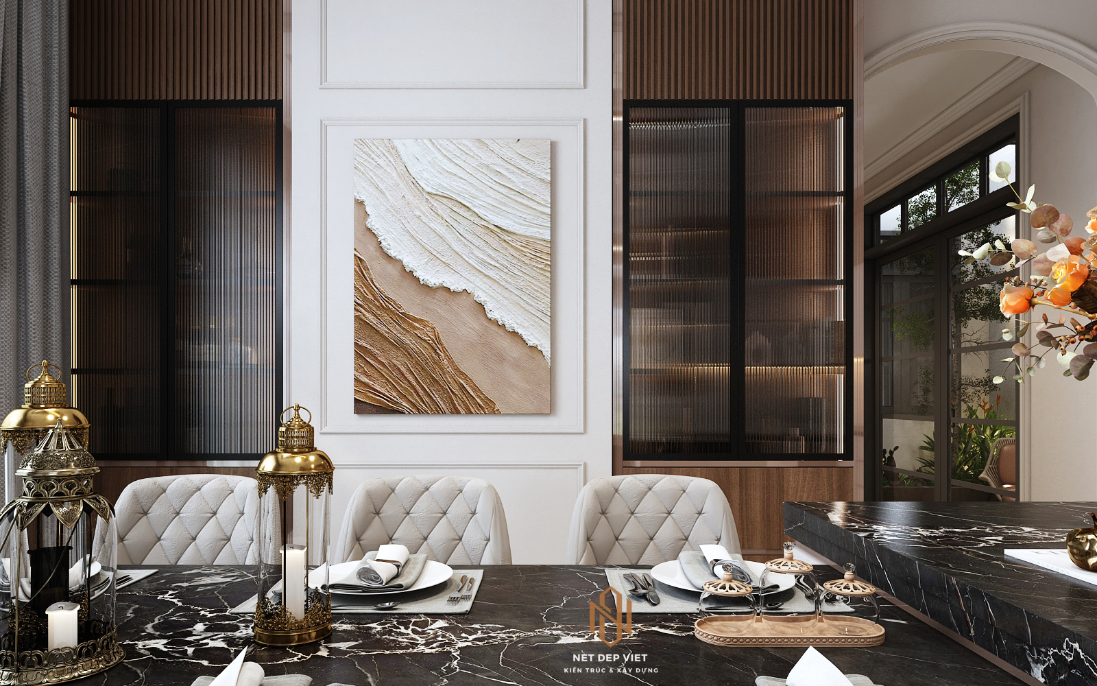 Gia tăng sự kết nối: Cửa kính lớn cũng xóa nhòa ranh giới giữa không gian sinh hoạt bên trong và khu vực sân vườn xanh mát bên ngoài.