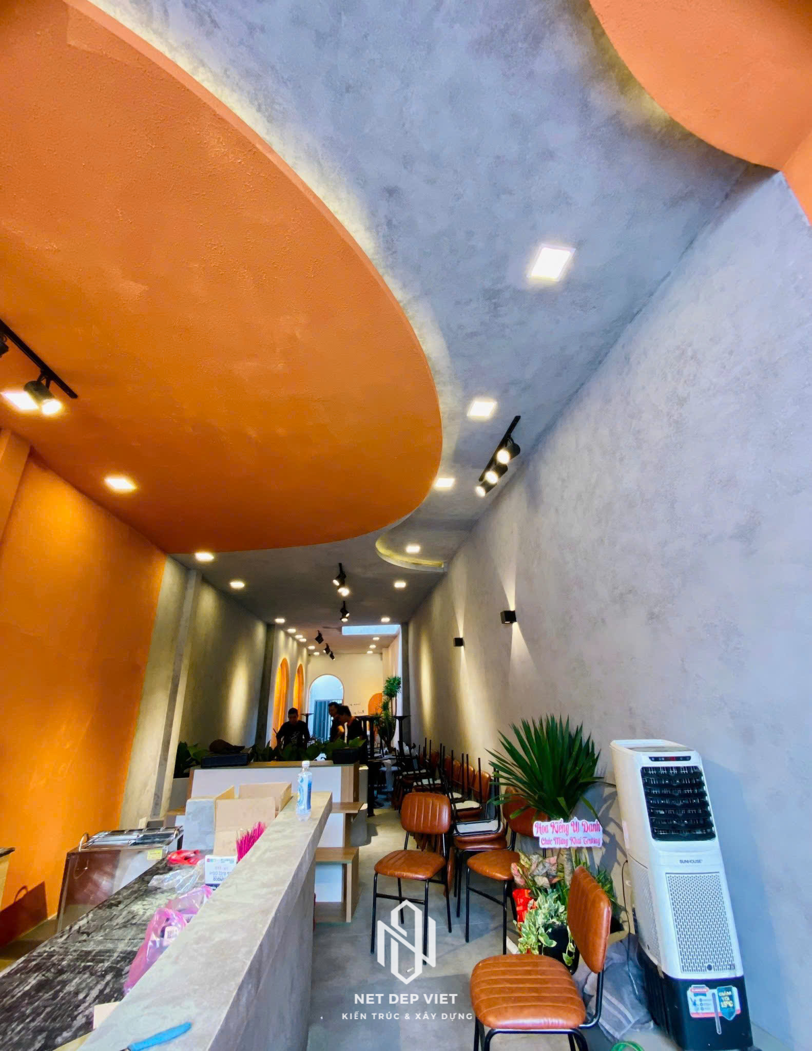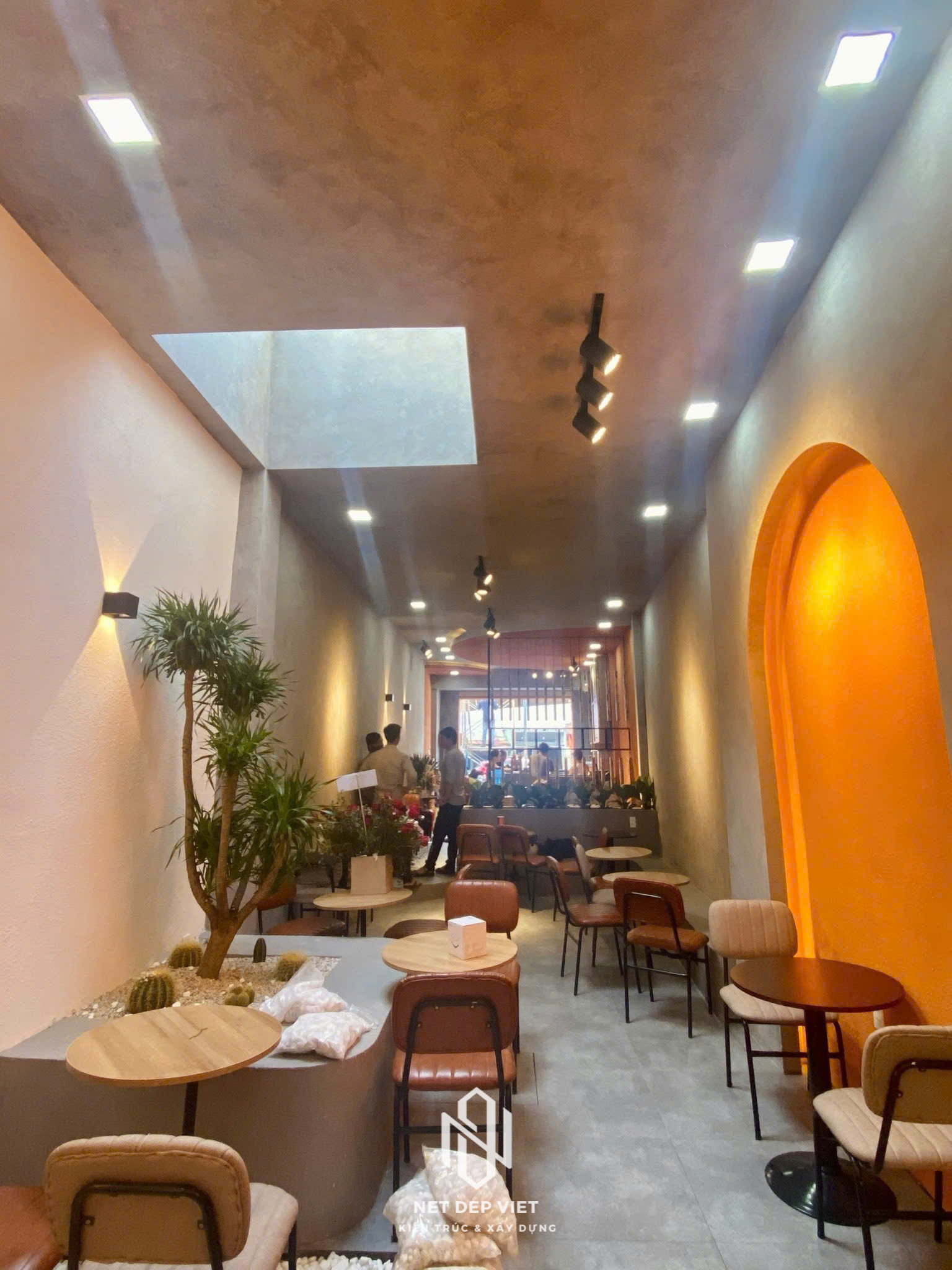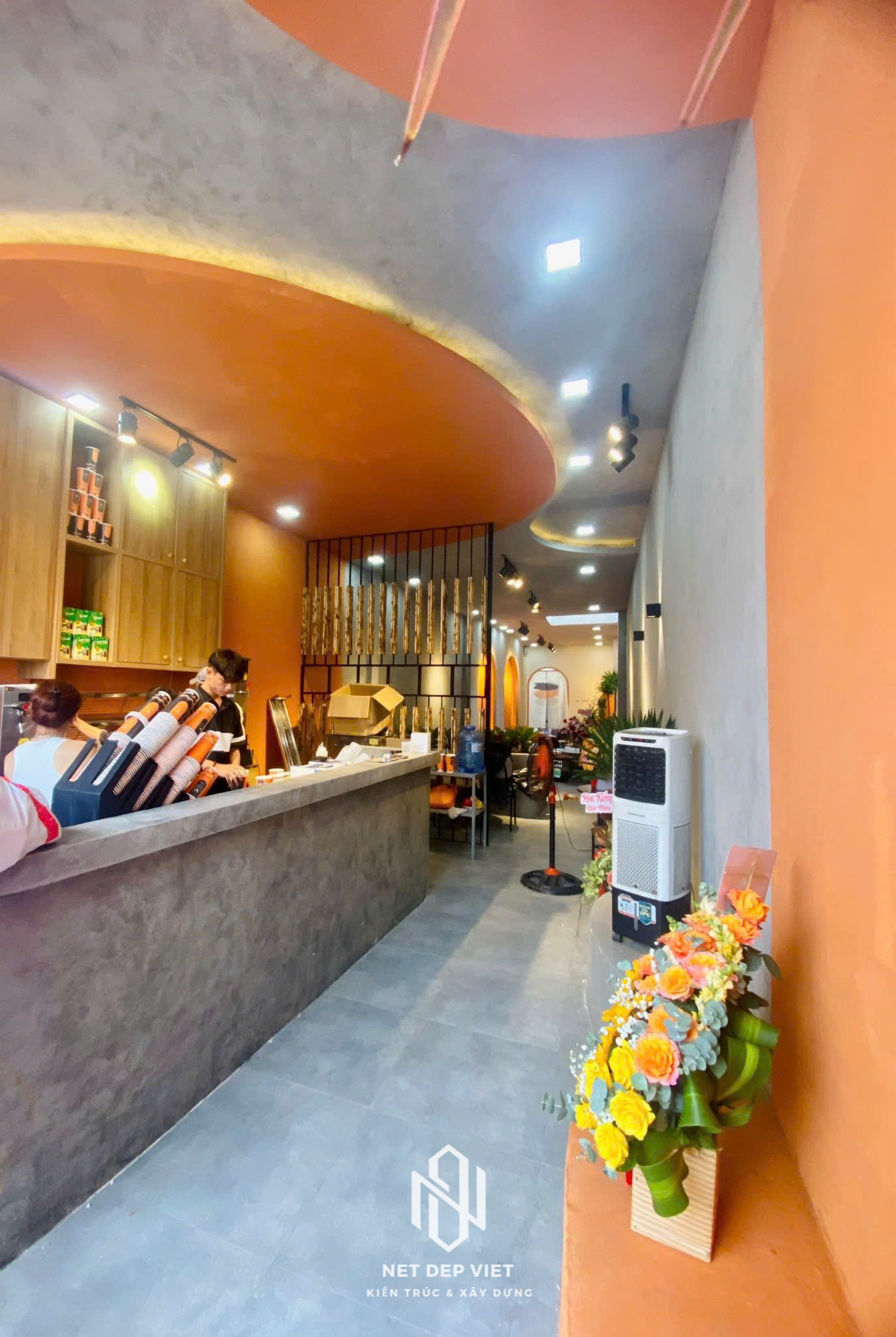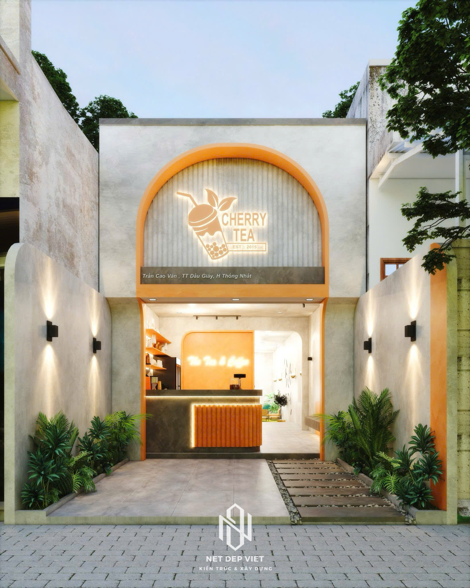 Mặt tiền ấn tượng: Sử dụng tông màu cam nổi bật kết hợp cùng các đường vòm cong mềm mại, tạo nhận diện thương hiệu mạnh mẽ ngay từ cái nhìn đầu tiên.