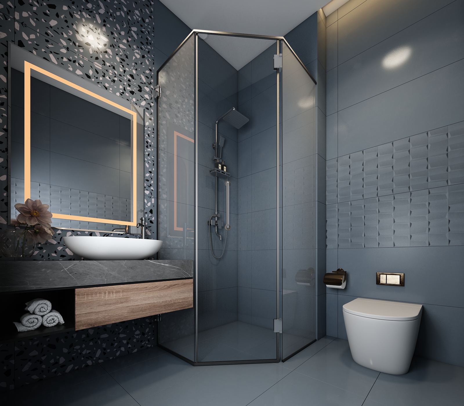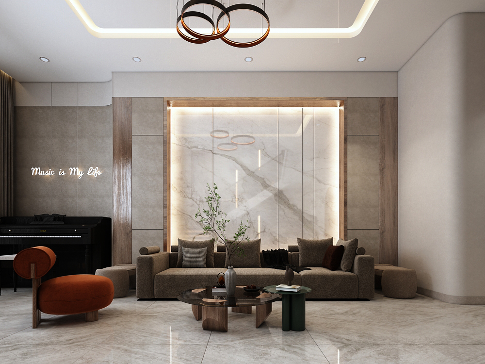 Vật liệu cao cấp: Sự kết hợp hoàn hảo giữa mảng tường trắng sứ, gạch ốp lát tone xám trầm và các hệ lam gỗ trang trí mặt tiền mang lại cảm giác ấm áp nhưng cực kỳ sang trọng.