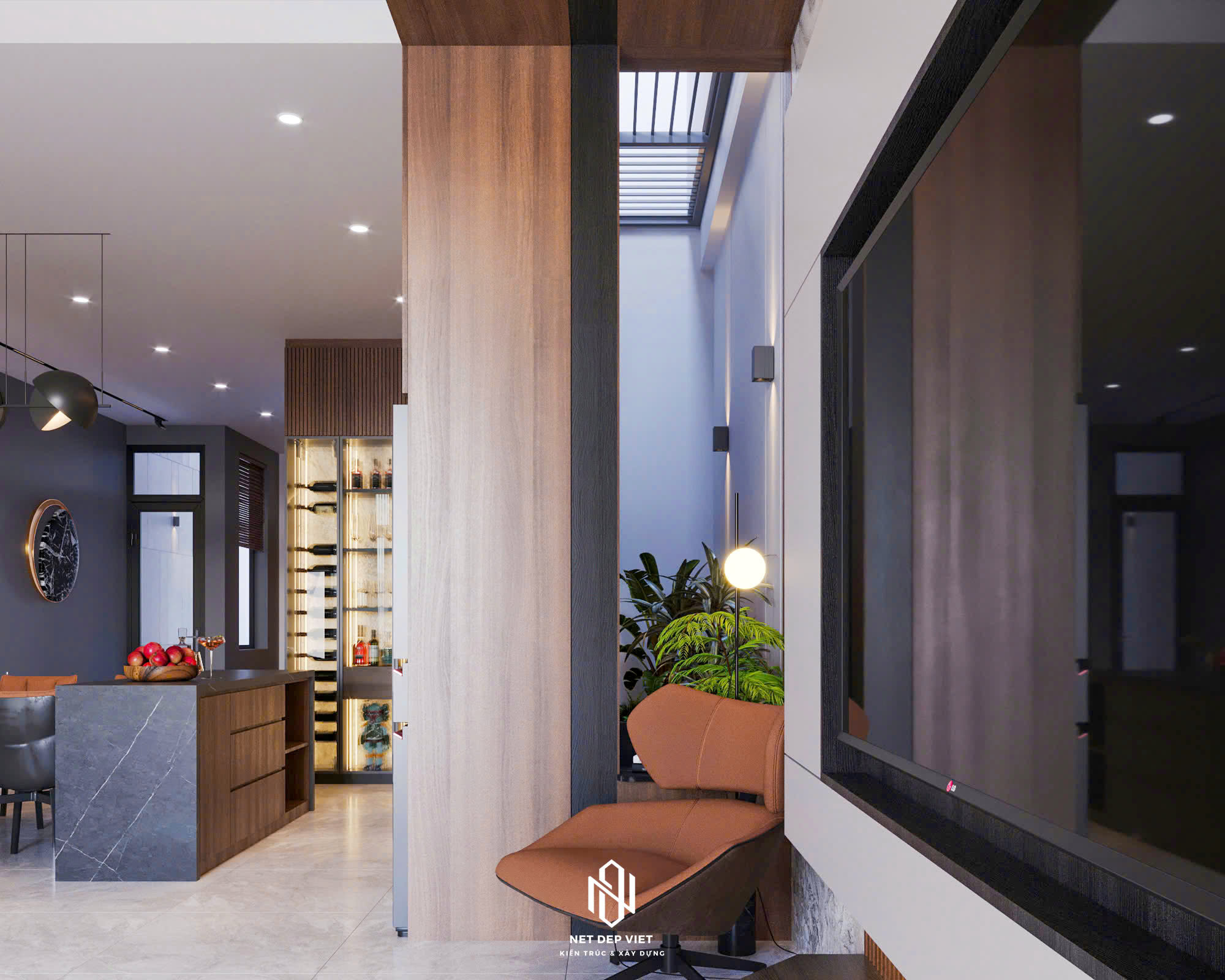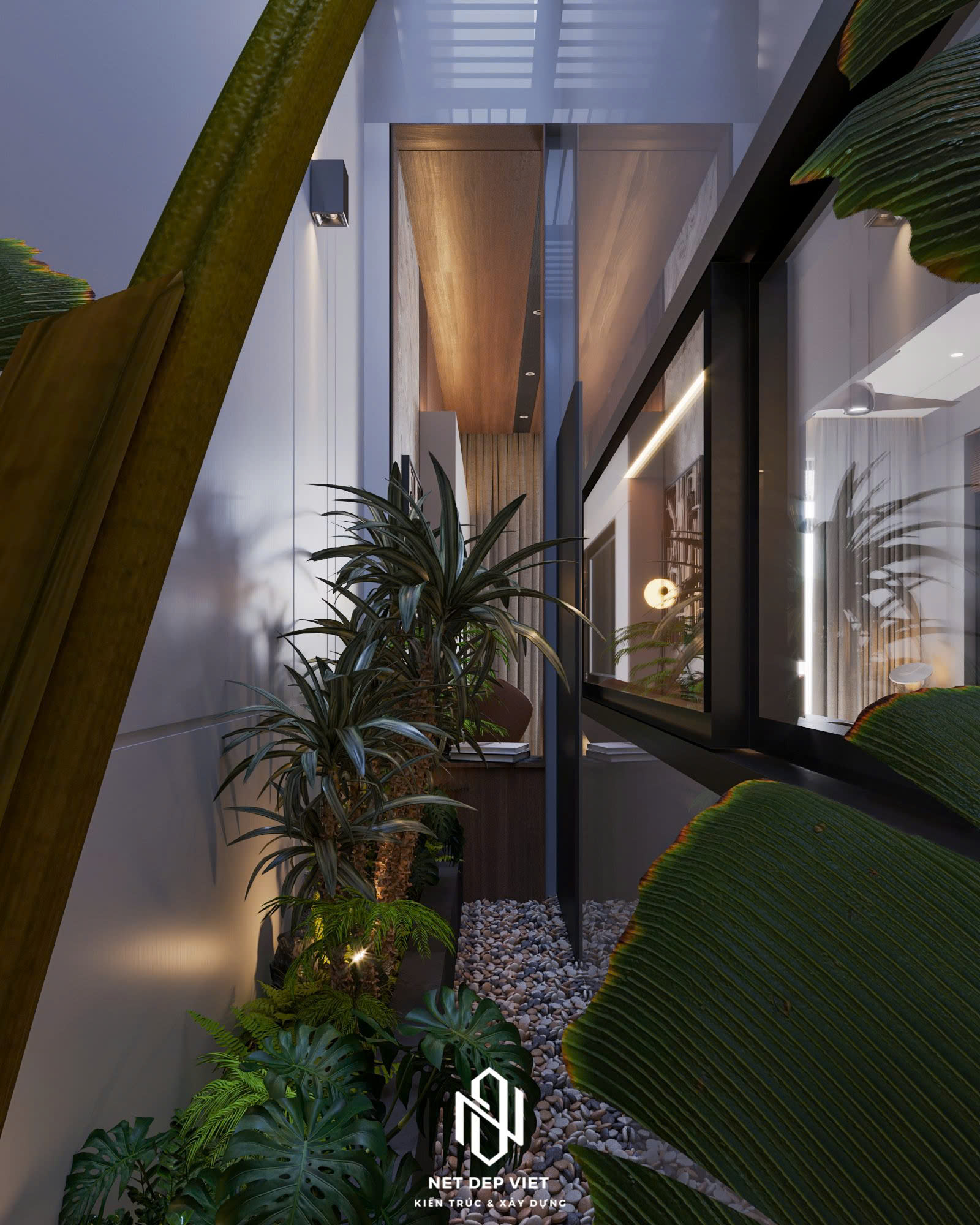 Điểm nhấn: Ban công kính sang trọng được trang trí bằng cây xanh và ghế treo thư giãn, tạo nên góc nghỉ ngơi lý tưởng. Hệ mái bằng tinh tế cùng dàn đèn LED âm trần làm nổi bật các đường nét ngôi nhà vào ban đêm.