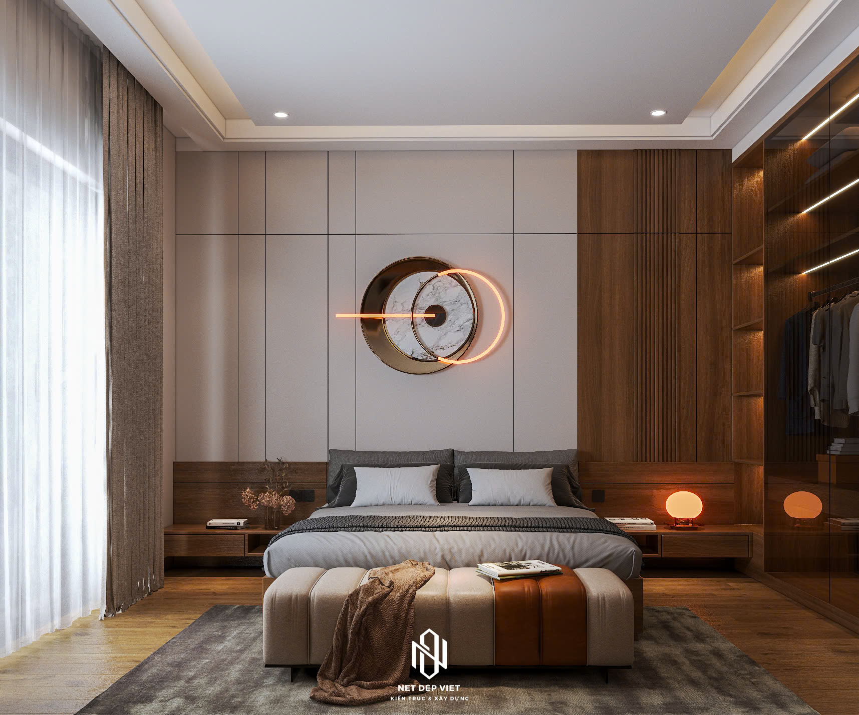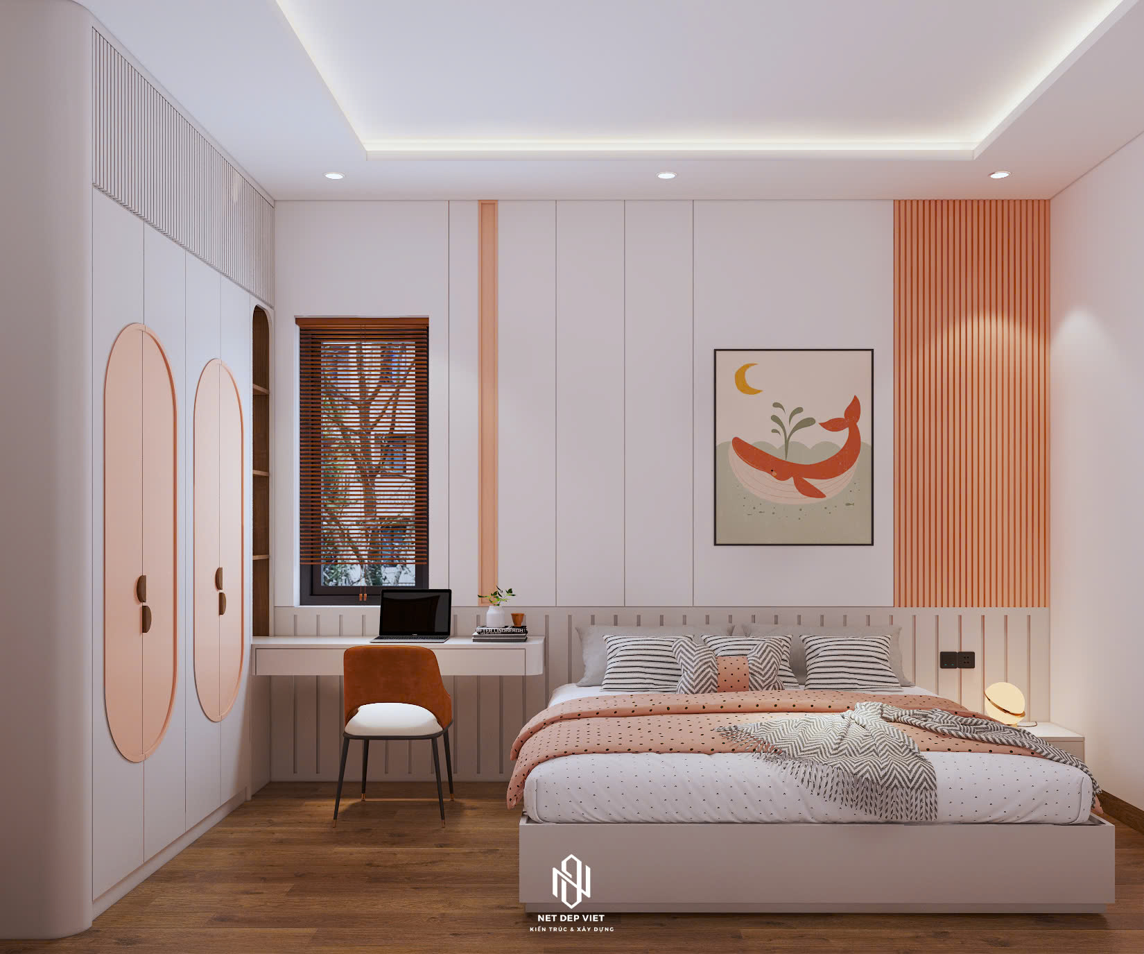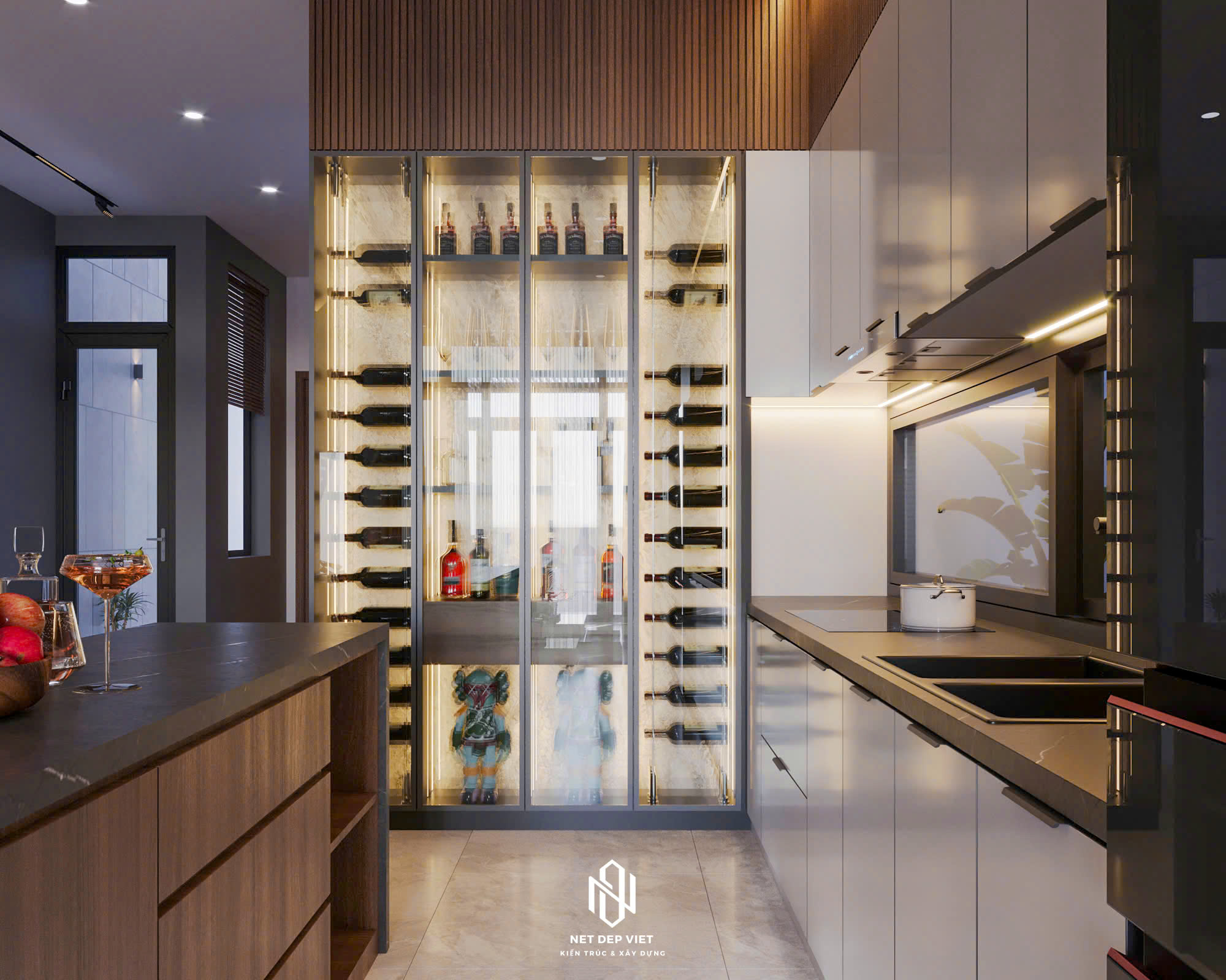 Thiết kế: Sự kết hợp hài hòa giữa gam màu trắng chủ đạo và các chi tiết ốp gỗ ấm áp dưới ban công. Hệ thống cửa kính cường lực lớn giúp tận dụng tối đa ánh sáng tự nhiên và mở rộng tầm nhìn.