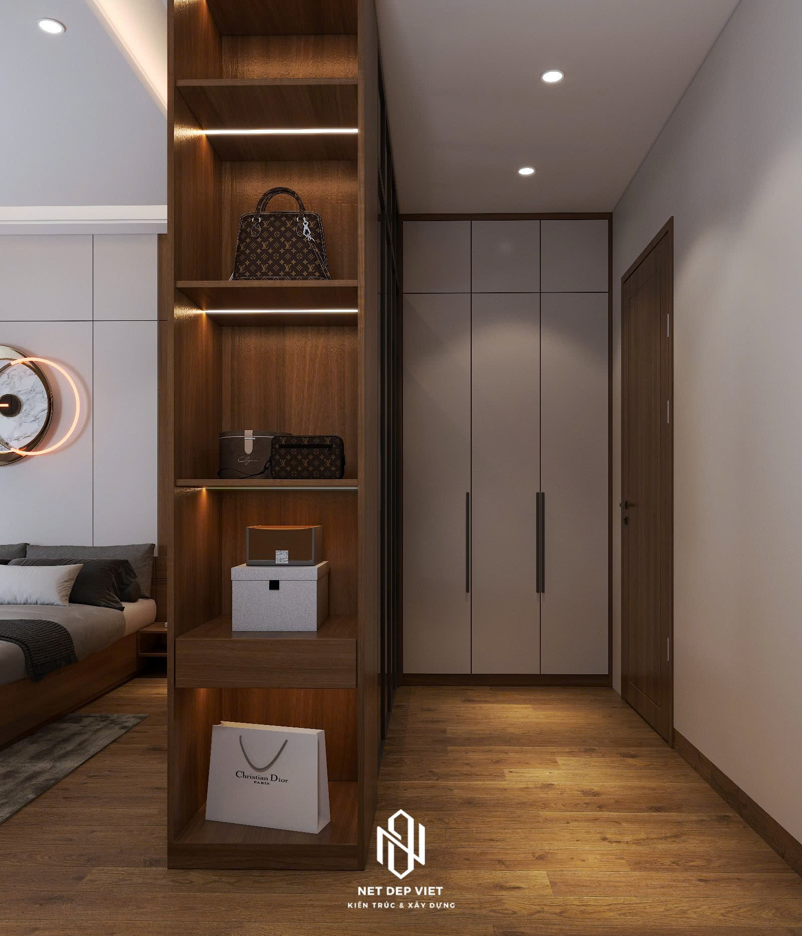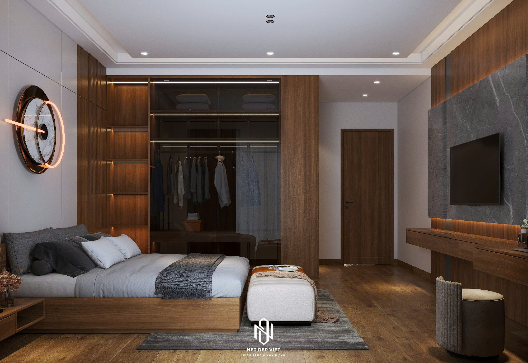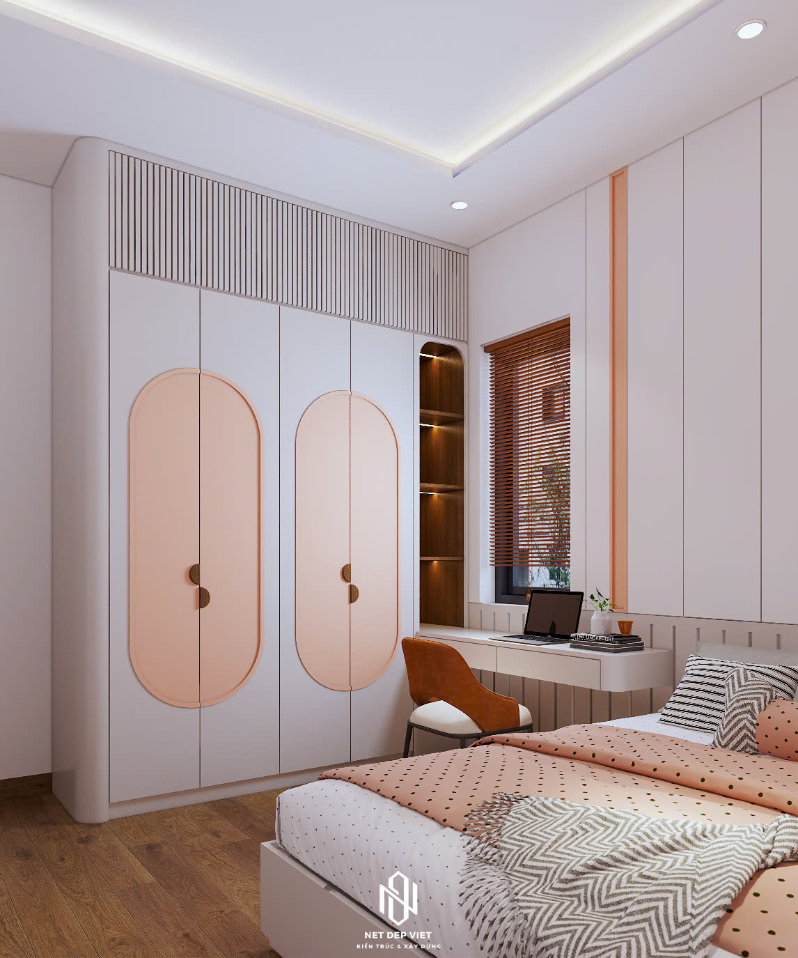 Thiết kế: Sự kết hợp hài hòa giữa gam màu trắng chủ đạo và các chi tiết ốp gỗ ấm áp dưới ban công. Hệ thống cửa kính cường lực lớn giúp tận dụng tối đa ánh sáng tự nhiên và mở rộng tầm nhìn.